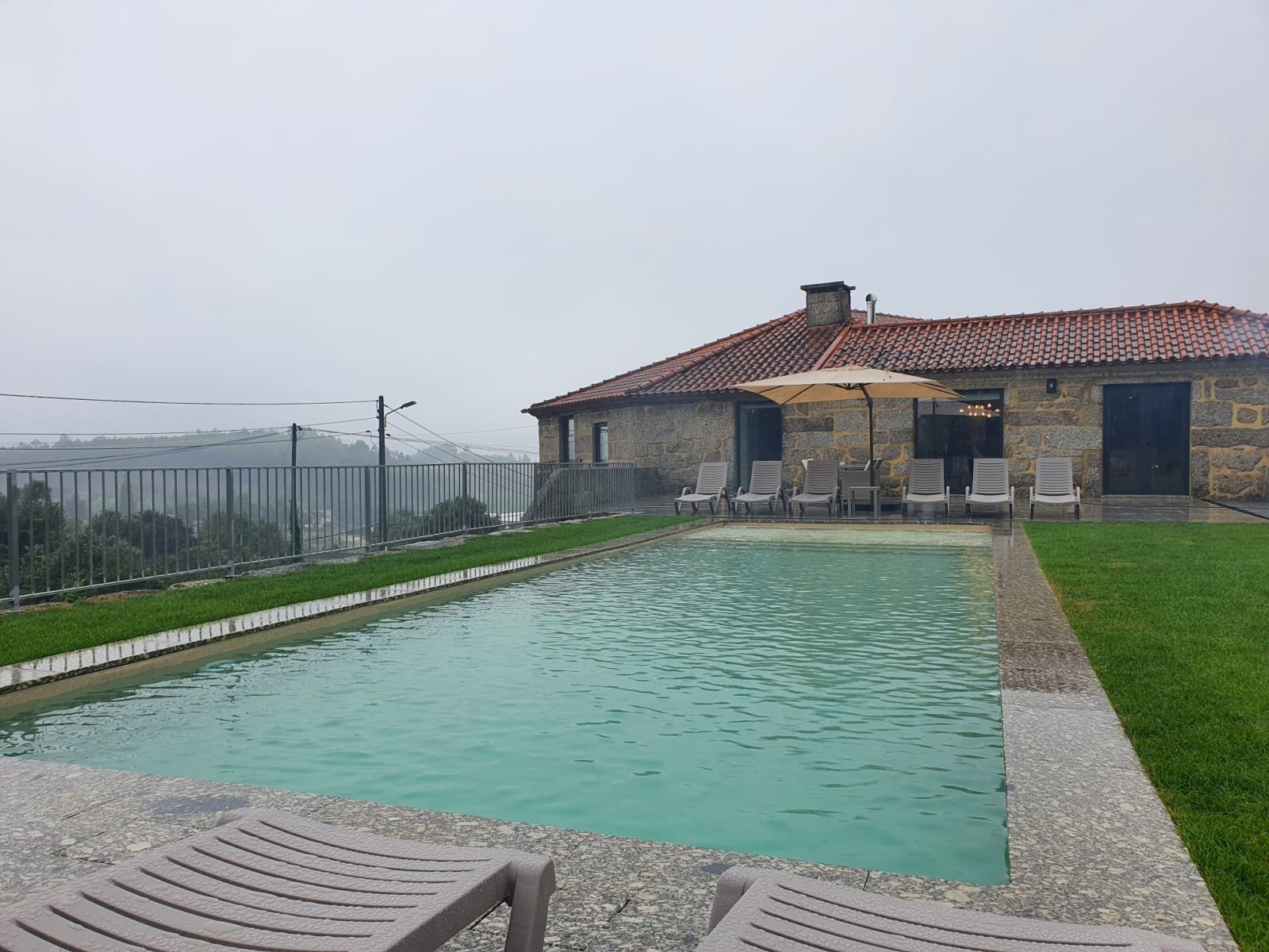 Espaço de lazer exterior com espreguiçadeiras