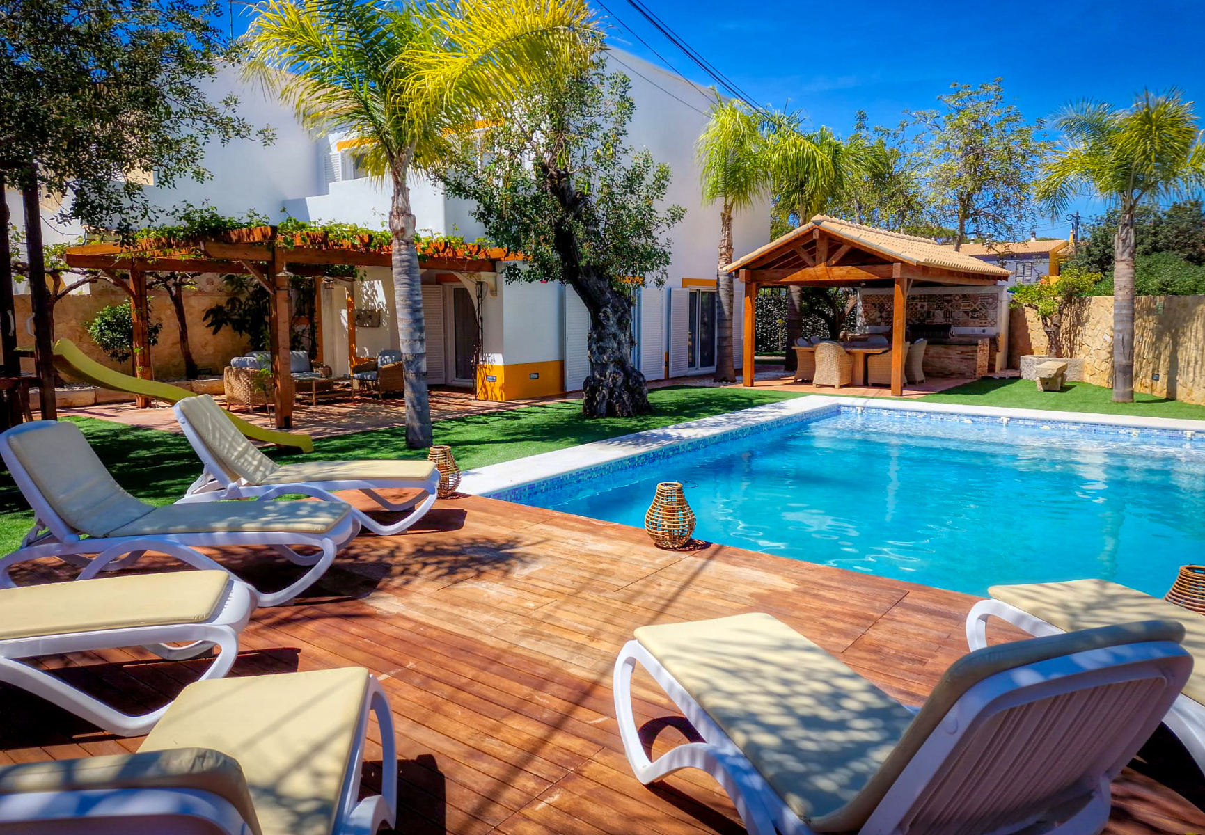 Espaço de lazer exterior com espreguiçadeiras